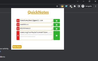 كمطورين أماميين ، نجد أنفسنا في كثير من الأحيان بحاجة إلى تدوين ملاحظات سريعة للرجوع إليها في المستقبل أو لحفظ البيانات لأغراض التصحيح. باستخدام quickNote ، يمكنك بسهولة إضافة ملاحظات جديدة عن طريق النقر فوق زر "ملاحظة جديدة" في النافذة المنبثقة. بالإضافة إلى ذلك ، يمكنك حفظ أي نص محدد عن طريق النقر بزر الماوس الأيمن واختيار الخيار "حفظ كملاحظة".
